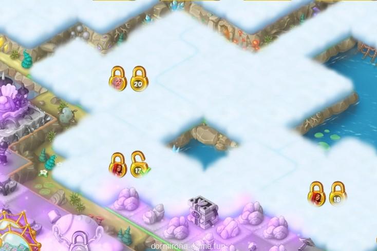 - 霧のかかった土地の上に必要キャラクター、必要レベルの鍵アイコンがあり、クリアしていればチェックマークがつく