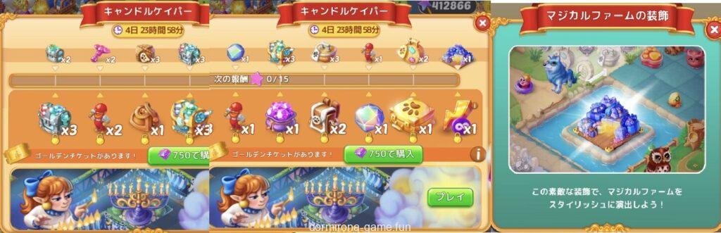 - 今回は最後の報酬がマジカルファームのランドマーク、ゴールデンチケットの最後の報酬が30分エネルギー×1