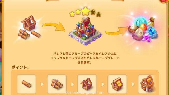 概要 完成済みのパレスに該当するピースを投入するとパレスのグレードが上がるグレードが上がるとパレスの報酬が増える5マージで最終段階のピースまでマージして2個ずつ投入 …