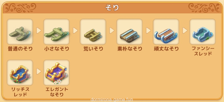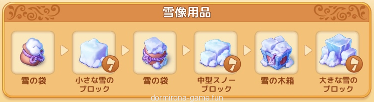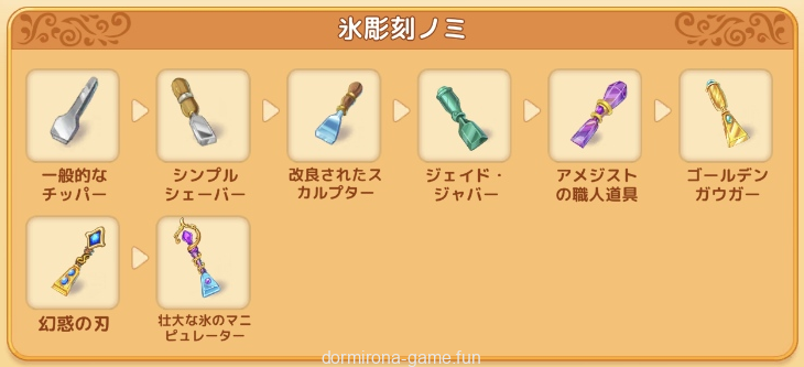 そり 3⇒4段階目、氷彫刻ノミ 4⇒5段階以降 | ブロンズの粉 |