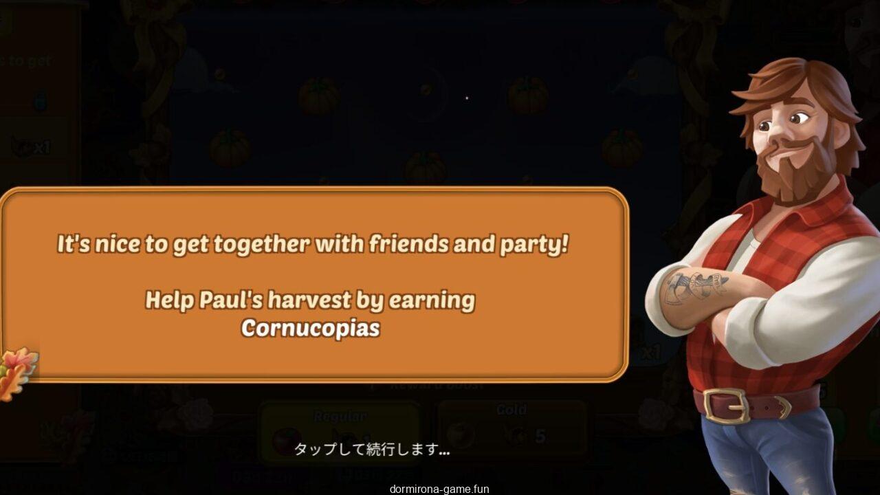 - タスクをクリアし、コルヌコピアを集めリンゴを落とすミニゲームをして報酬を受け取る