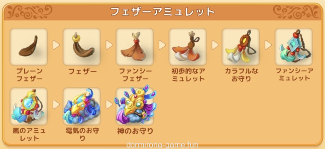 フェザーアミュレット 3⇒4段階目、くちばし 4⇒5段階以降 | ブロンズの粉 |