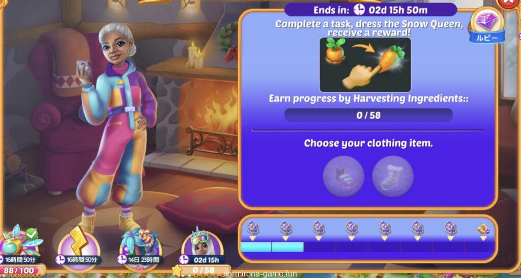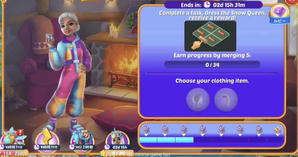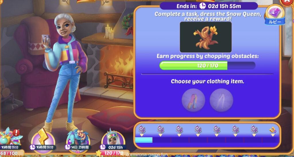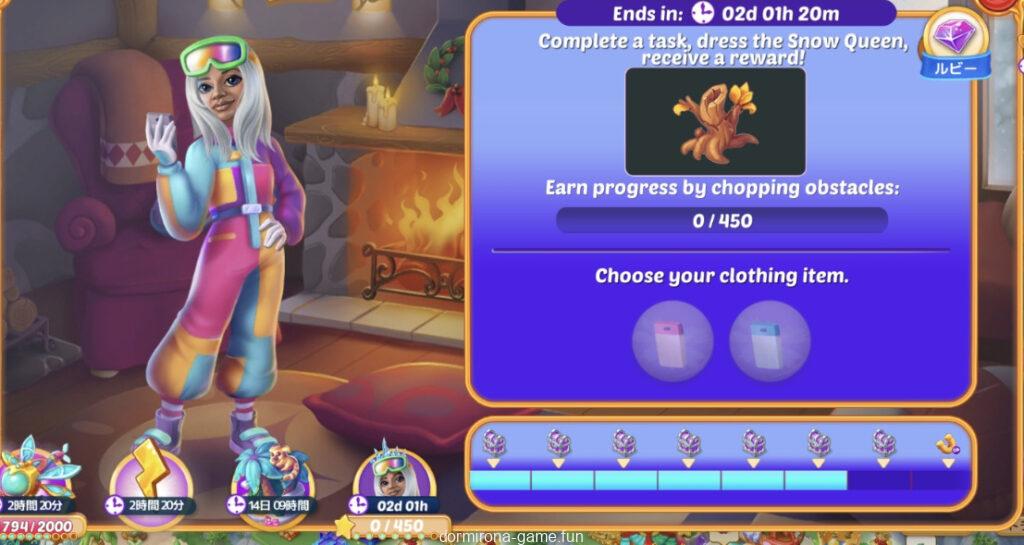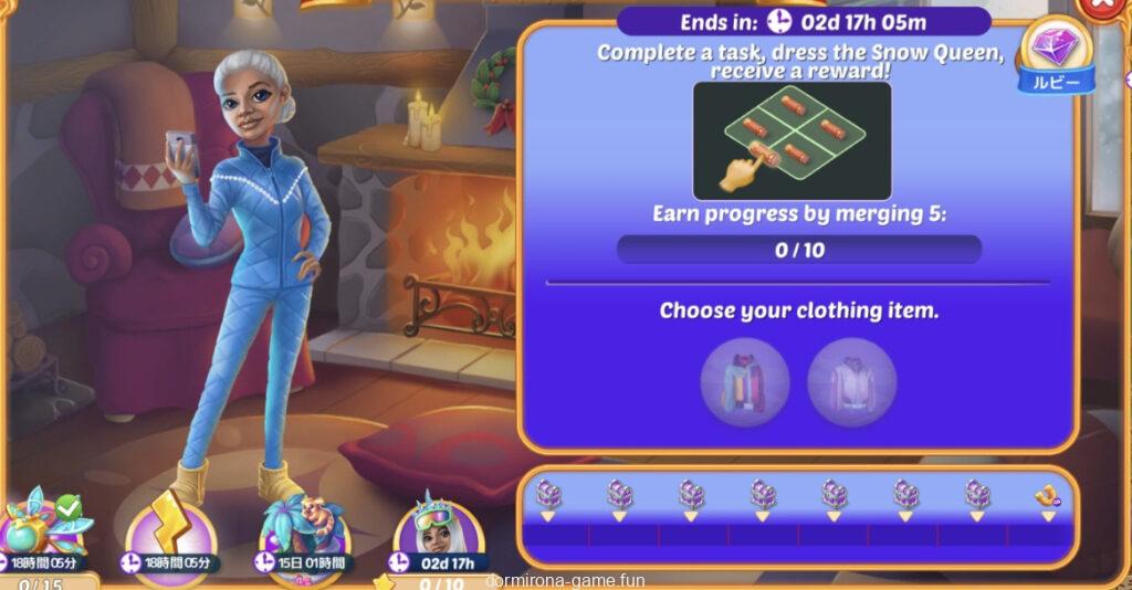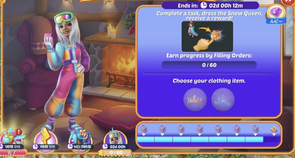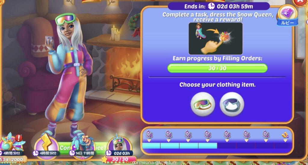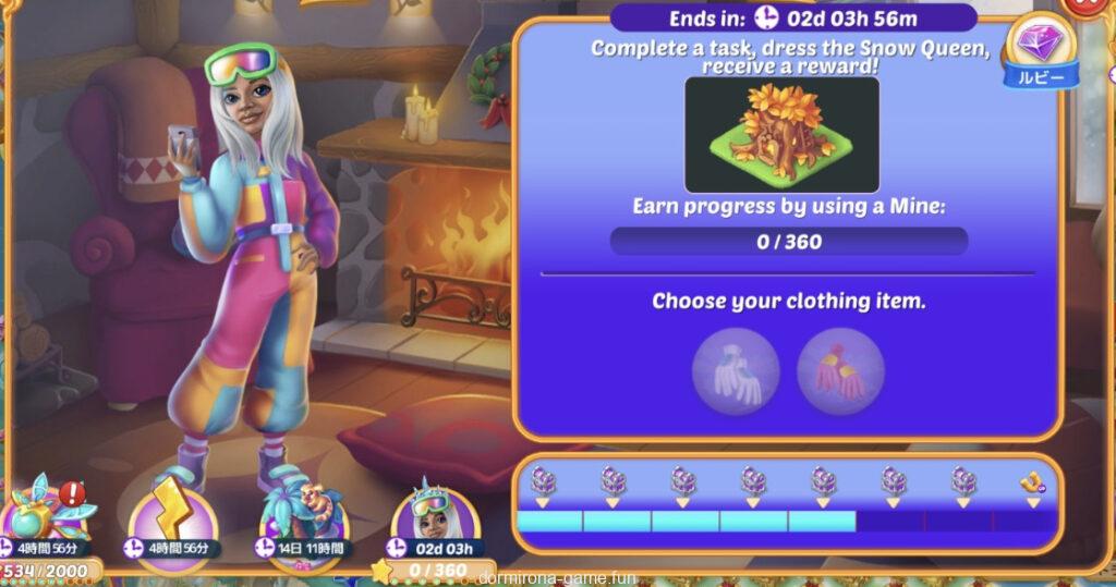 - タスクをこなして雪の女王がスキーシャレーに行くときの服装を選ぶ(2択)