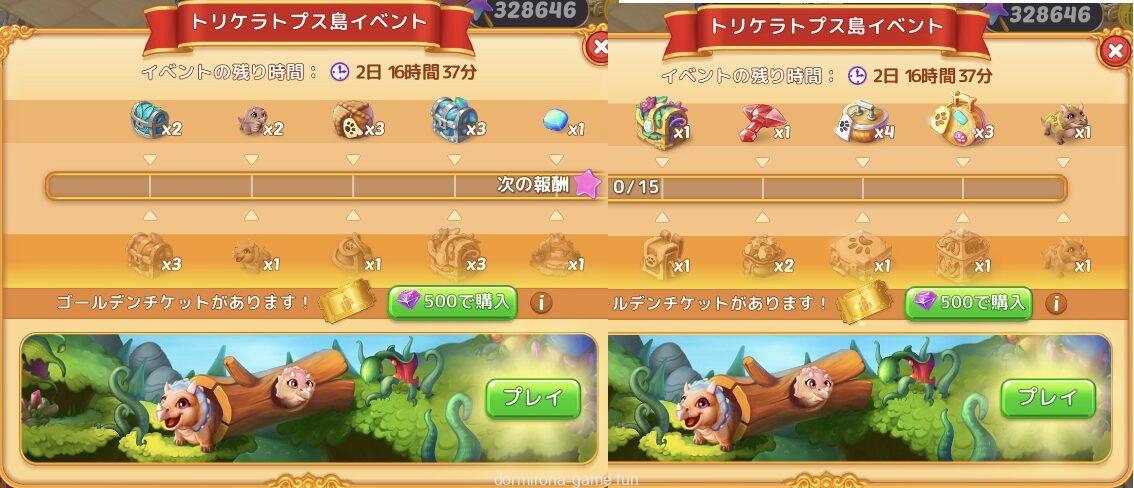- 以前と仕様が変わり、イベントクリア後もマージ時エネルギー、ブロンズの粉、ルビーの粉は出るが、トリケラトプスのオーブは出なくなる