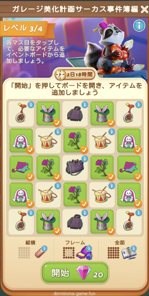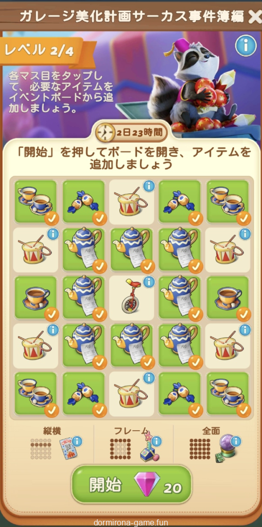 イベント放置でどうにかデイリーチャンスクリア。出たり入ったりでちまちま看板広告作るくらいでガレージを迎える。盤面は下記