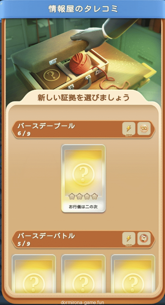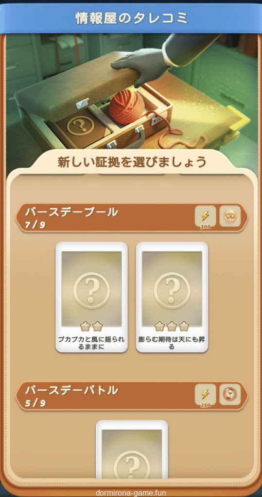 - パス、各種イベント報酬、デイリーチャンス・デイリートレードの宝箱等でもらえる封筒を集め手がかりをコレクションする