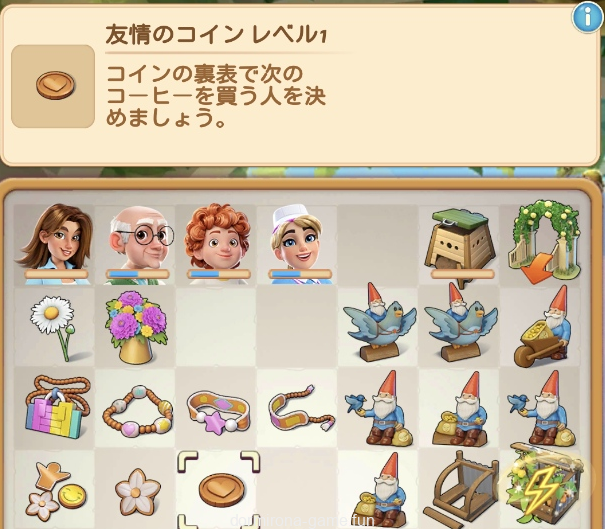 それぞれのキャラクターが求めるものを納品して報酬をもらってポイント貯める新タイプ。キッチンカーのところの単体デコがグレードアップしていくのは同じだね。最終的に友情の証を集めてイザベラと仲良くなるってことかなー?