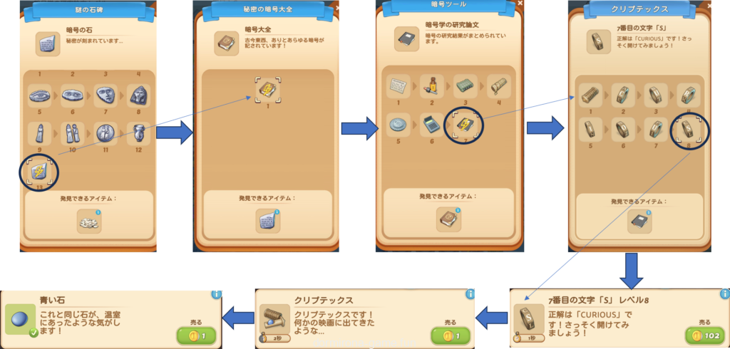ショートカットするなら、アンロック用の他に秘密結社の後半のタスクでも青い石が必要なのでハサミやブルーカードを使って初めから2個作るのもあり。ただ筆者はもう1個必要だと知ったときにはもう仕上げてしまっていたので試していませんが、Lv8はすぐ変化してしまうのでできた瞬間ハサミを即使わないといけないので自己責任でお願いします。
