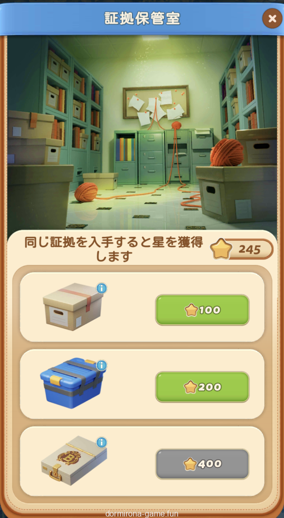 - ダブったカードのレアリティの☆の数がそのまま証拠保管庫に貯まっていきそのポイントを消費して新しい封筒に交換可能(新手がかり確定ではない)