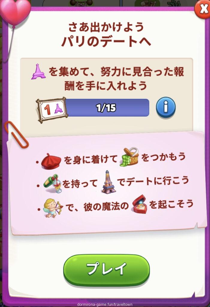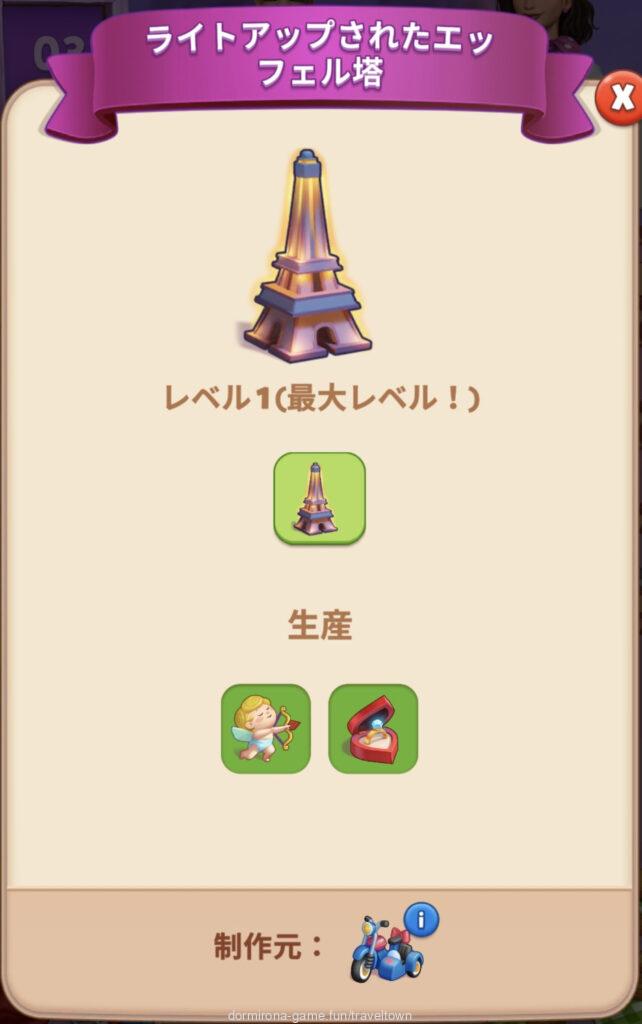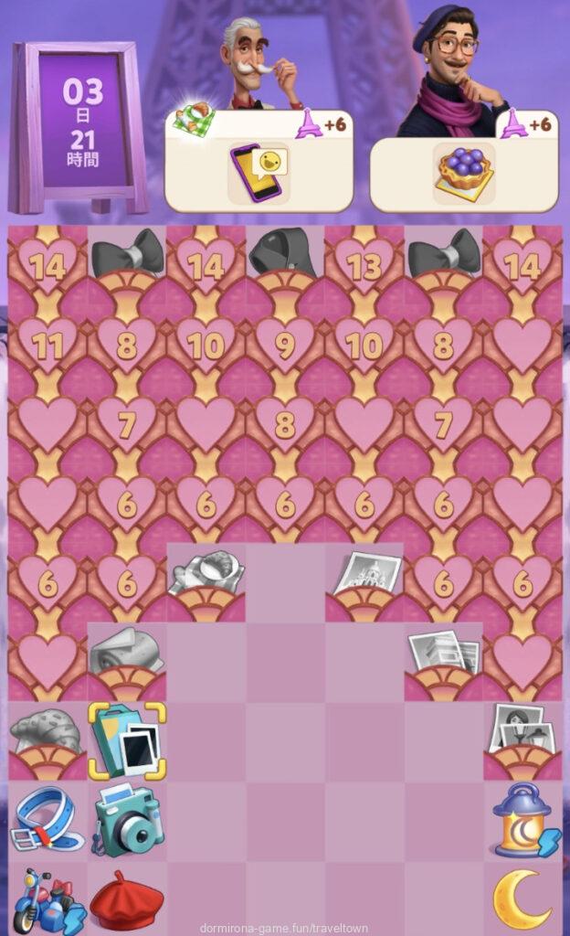 - ラブレターが盤面にある状態でライトアップされたエッフェル塔をタップする(2タップ)と婚約指輪が出る(12タップ)⇒ブライダル小物、ワインのライン