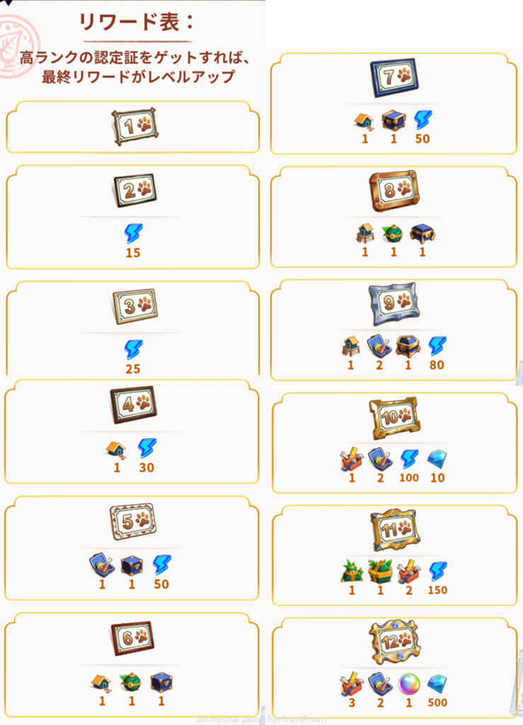 - 高ランクの認定証を手に入れるほど最終リワードがレベルアップする