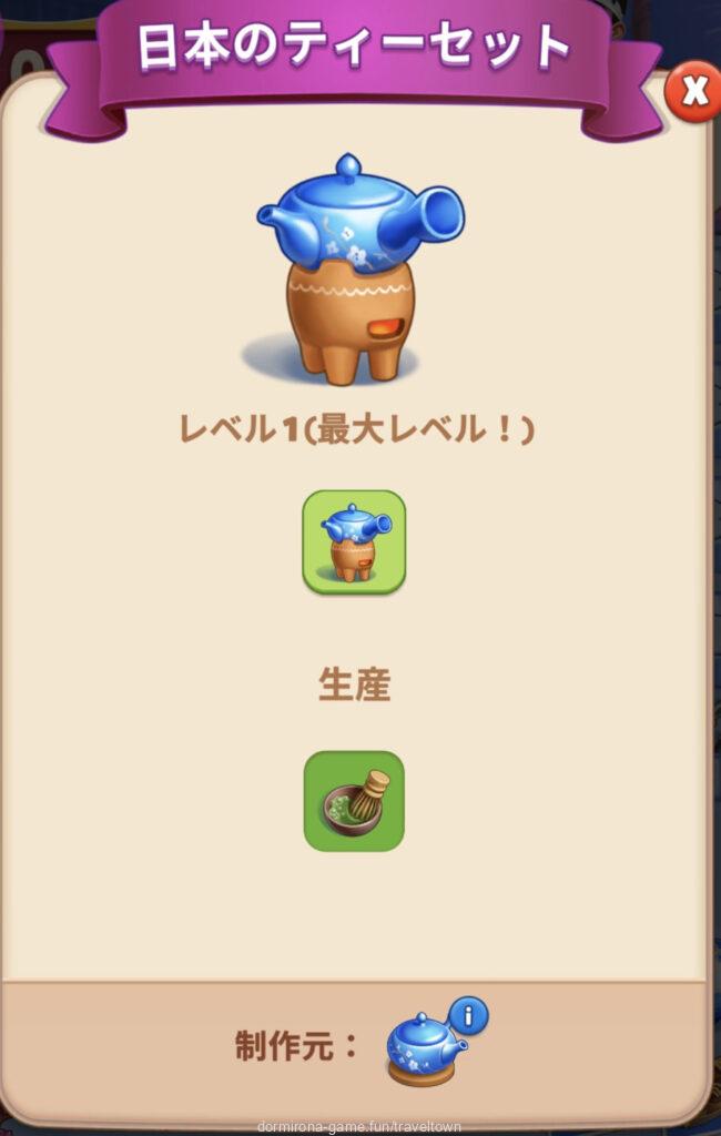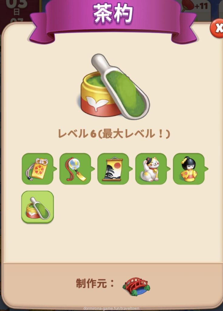 - Lv5に隠れている急須(やかん?)を日本のお土産MAX(茶杓)が盤面にある状態でタップすると日本のティーセットになりタップできるようになる(4タップ)⇒抹茶ミックスになりタップすると抹茶ラテになる⇒抹茶スイーツのライン