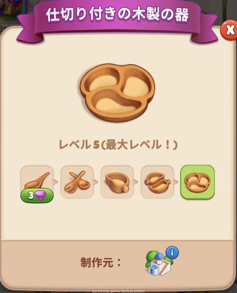 - 木の食器MAX(仕切り付きの木製の器)をオリーブMAX(ギリシャのオリーブ)が盤面にある状態でタップするとオリーブの皿になる