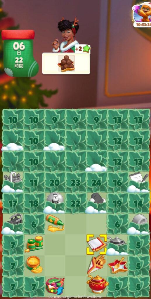 - Lv17の霜に隠れているクリスマスハウスをキャンディケインが盤面にある状態でタップするとサンタの家になりタップできるようになる(7タップ)⇒トナカイ、新鮮な草のライン