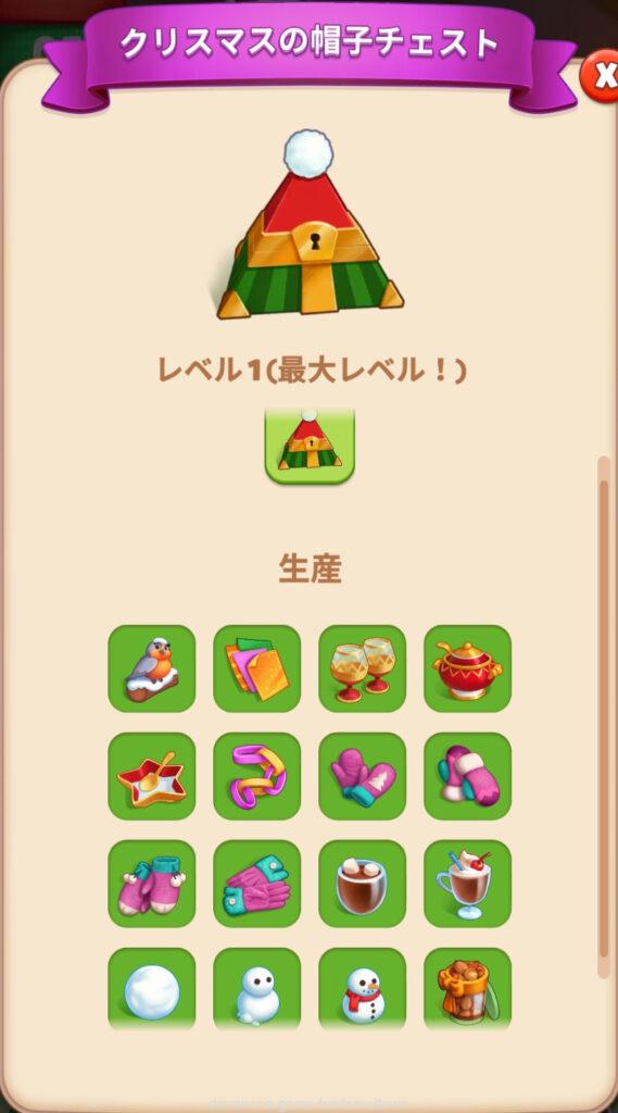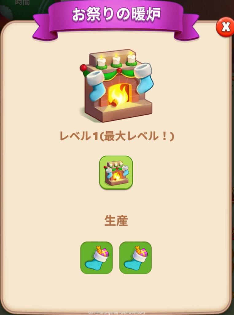 - Lv22の霜に隠れている飾られた暖炉を、サンタのそりがある状態でタップするとお祭りの暖炉になる⇒ホットココアLv3がある状態でタップ(2タップまで)するとプレゼントソックスが出る