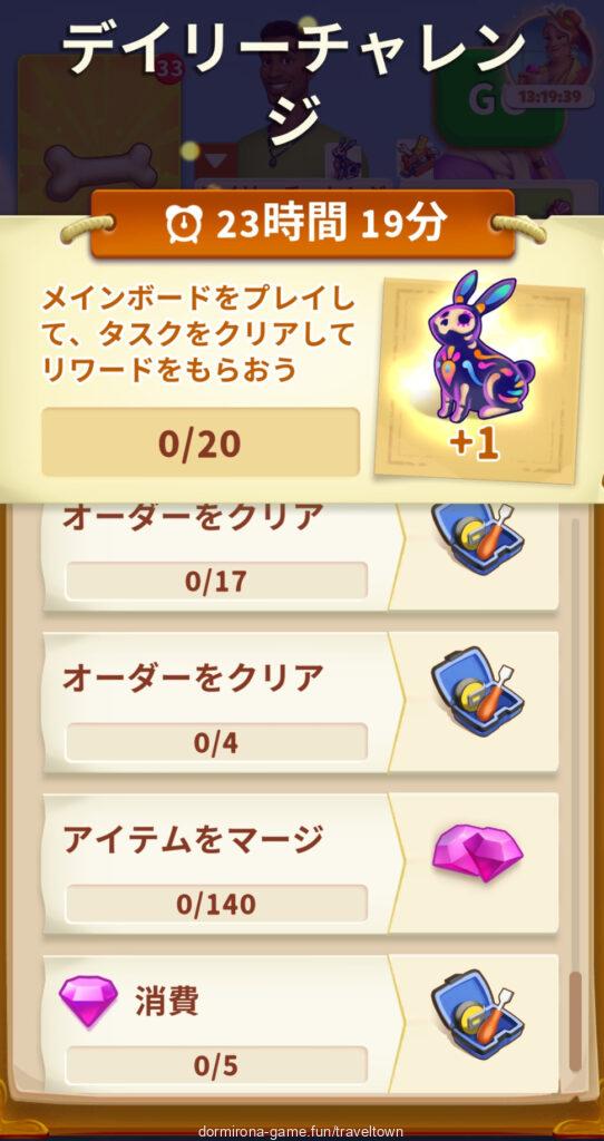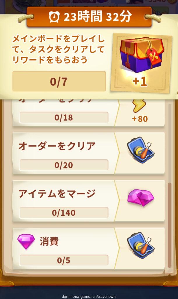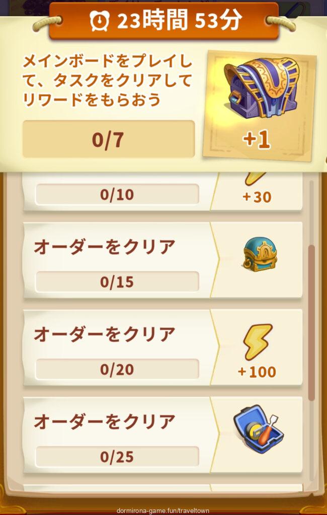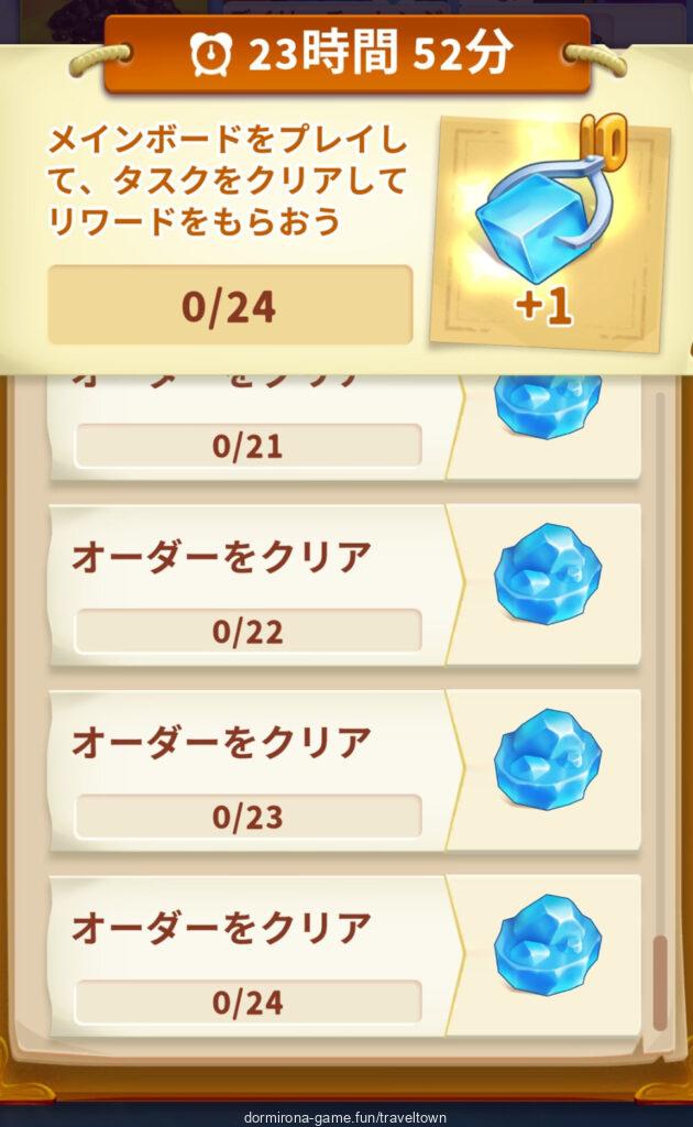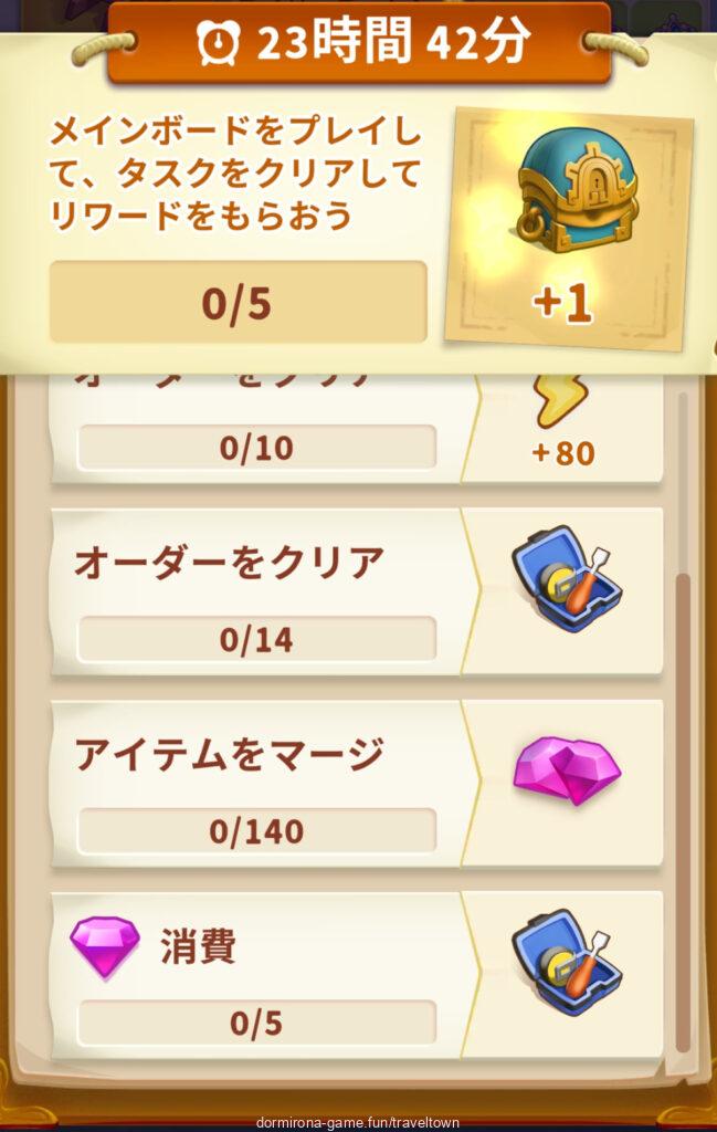 - 1日間、30オーダー+140マージ+5ダイヤ消費 前々回と同じ *コインを集めるタスクもある模様?
