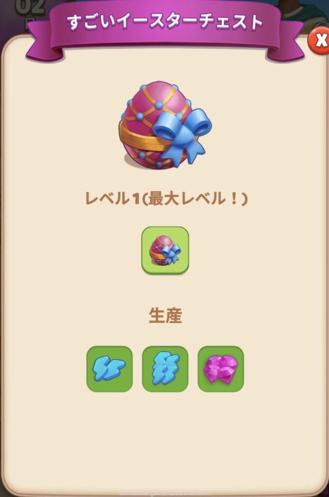 - Lv16の柵に隠れているイースターの茂みをタップすると小さな苗が出て最後までマージすると再度イースターの茂みになり卵が出る