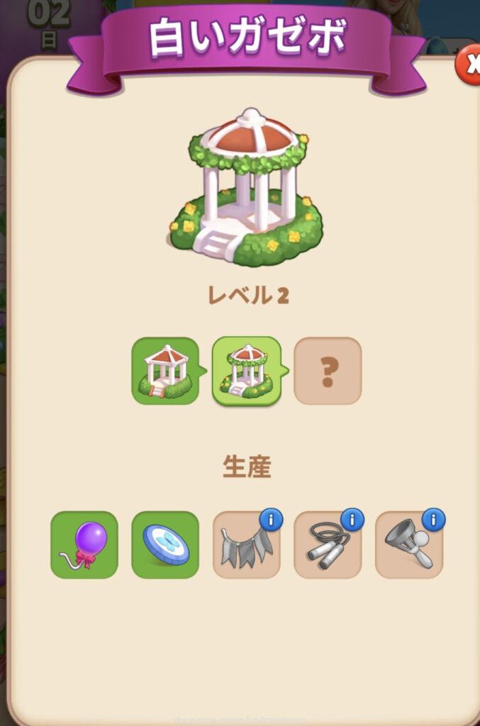 - 白いガゼボ(Lv2)になると風船が出るようになる⇒パーティーグッズのライン