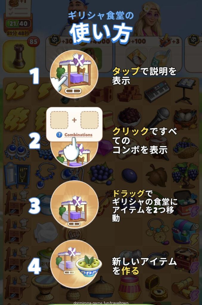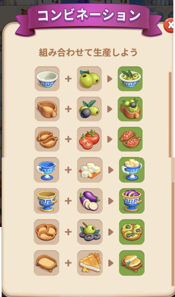 - 盤面のギリシャの食堂に表示されている食器とオリーブの組み合わせで料理を作る