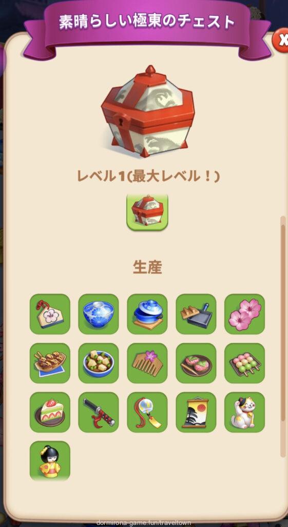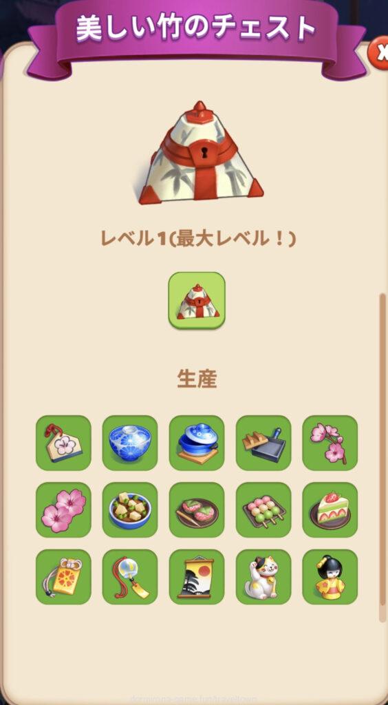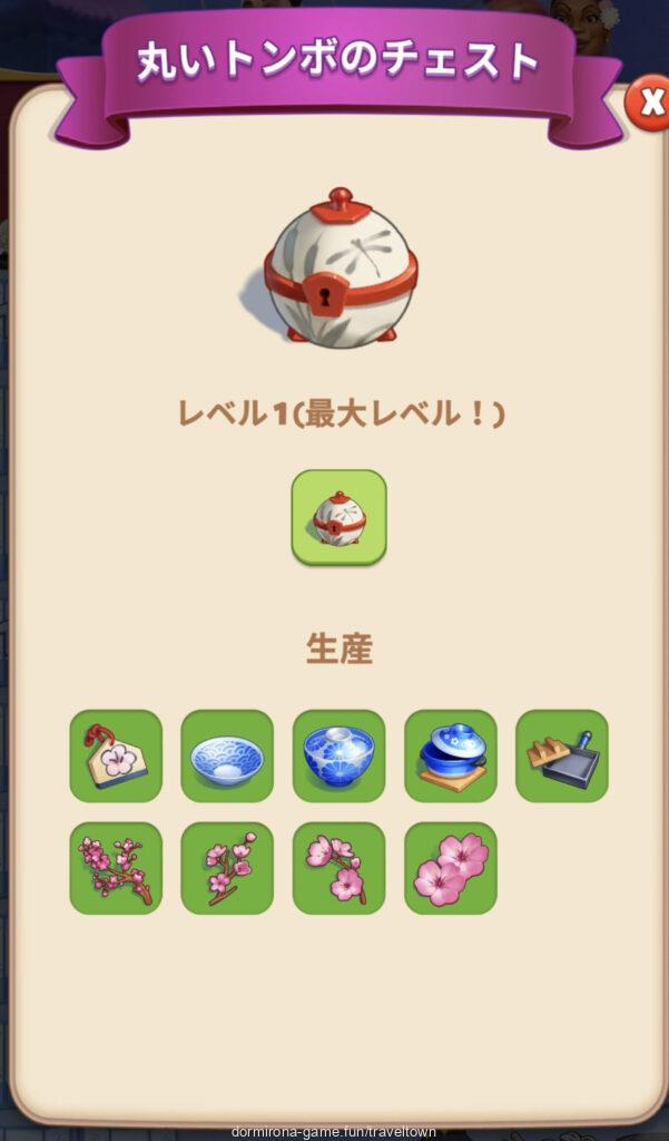 仮面からはエネルギーがもらえる⇒MAX(天狗の仮面)で60エナジー?今回はない模様- Lv10の屏風に隠れている急須(やかん?)を日本のお土産MAX(茶杓)が盤面にある状態でタップすると日本のティーセットになりタップできるようになる(4タップ)⇒抹茶ミックスになりタップすると抹茶ラテになる⇒抹茶スイーツのライン