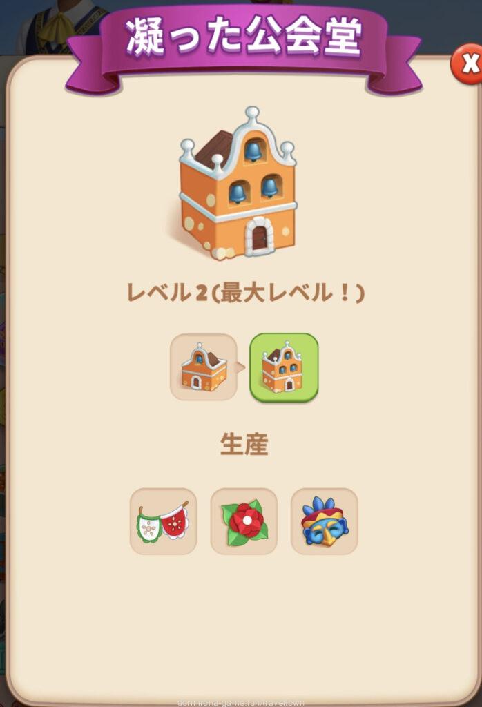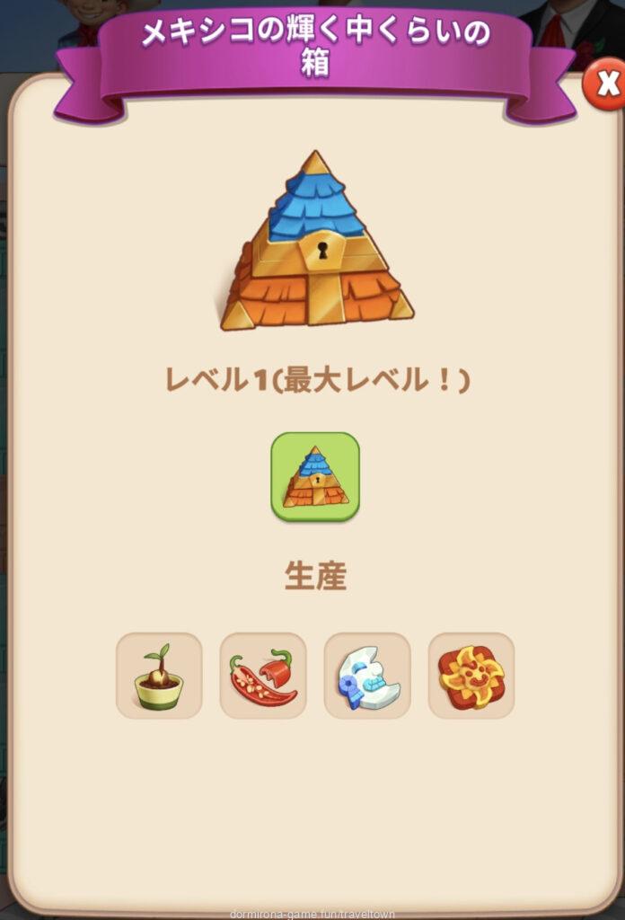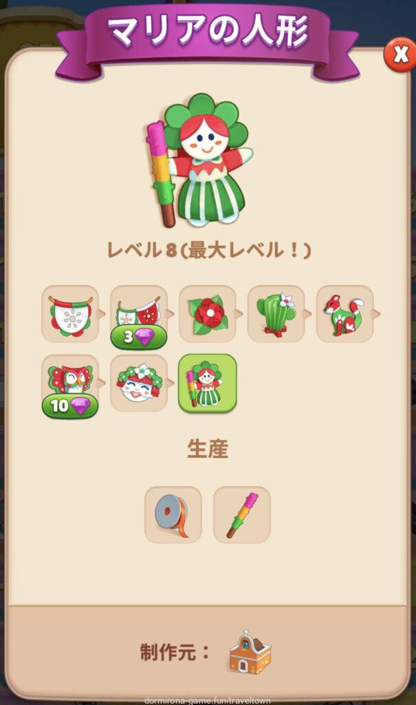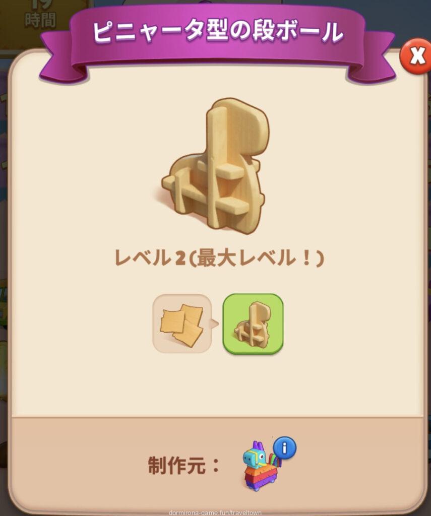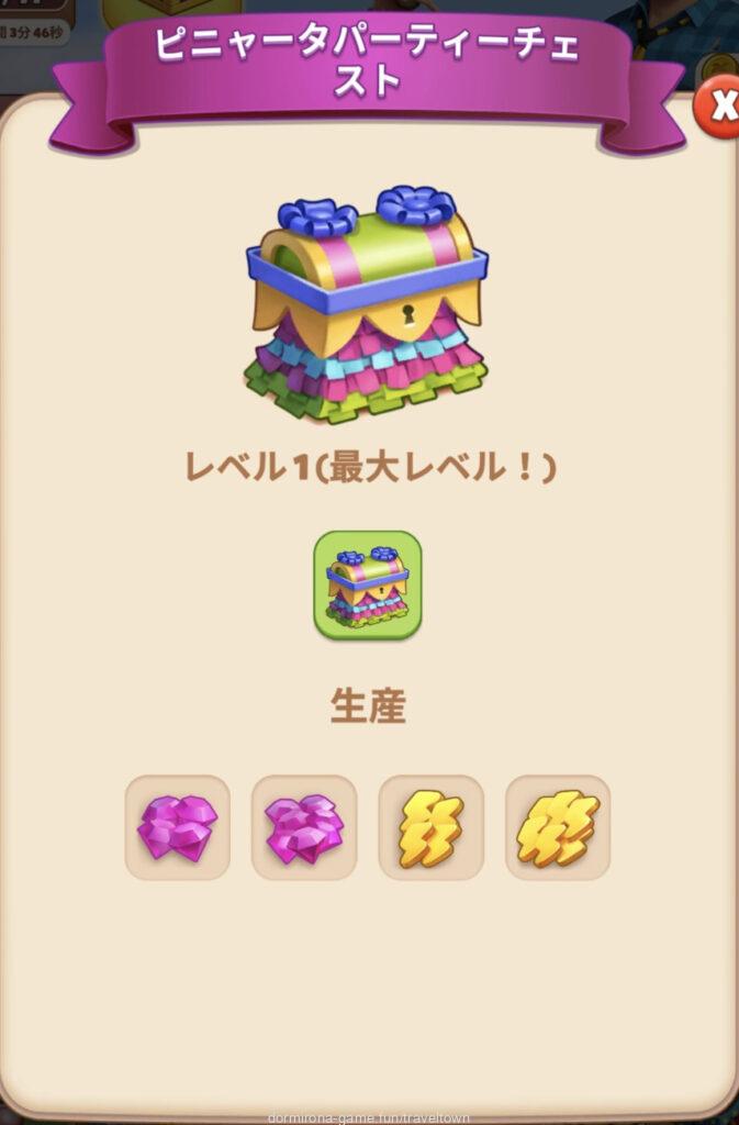 - Lv7の壁画に隠れている公会堂Lv1から出る吊り下げる吹き流しMAX(マリア人形)からはオレンジのリボン、ピニャータ棒が出る