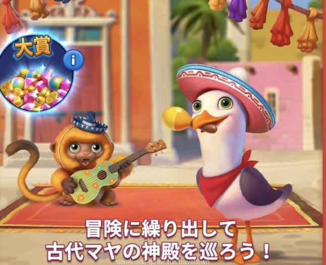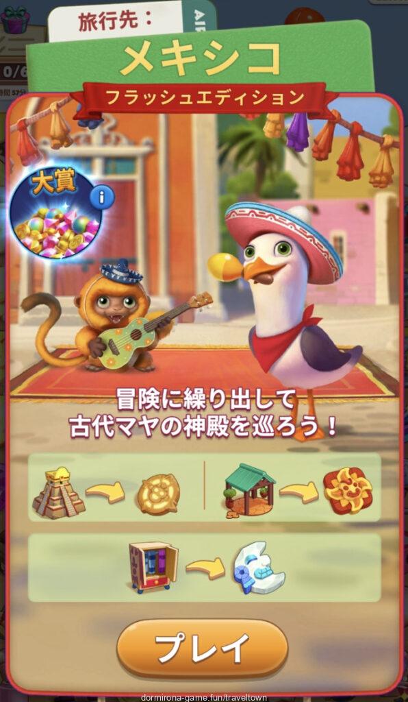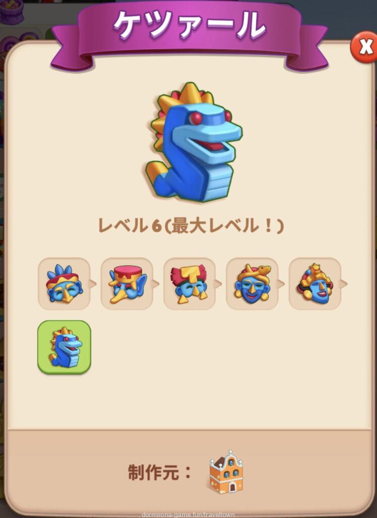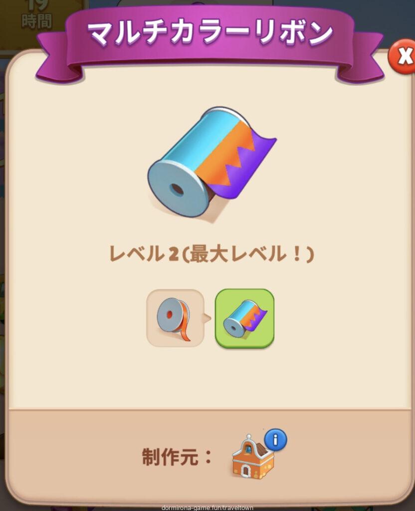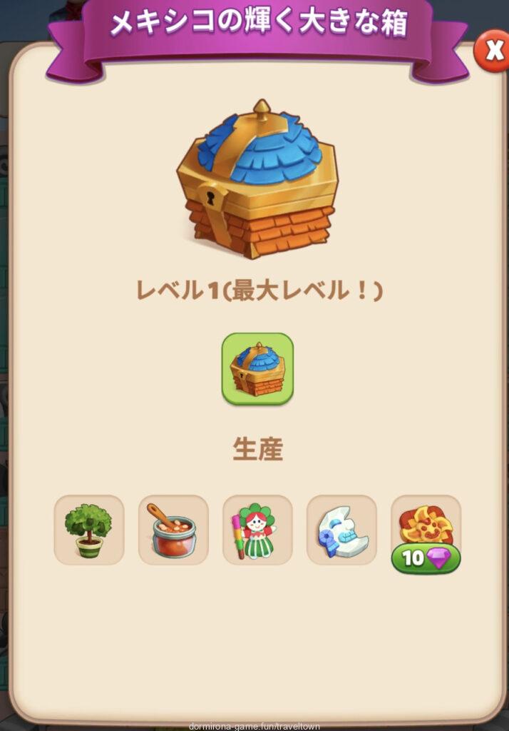 - Lv7の壁画に隠れている公会堂Lv1から出る吊り下げる吹き流しMAX(マリア人形)からはオレンジのリボン、ピニャータ棒が出る