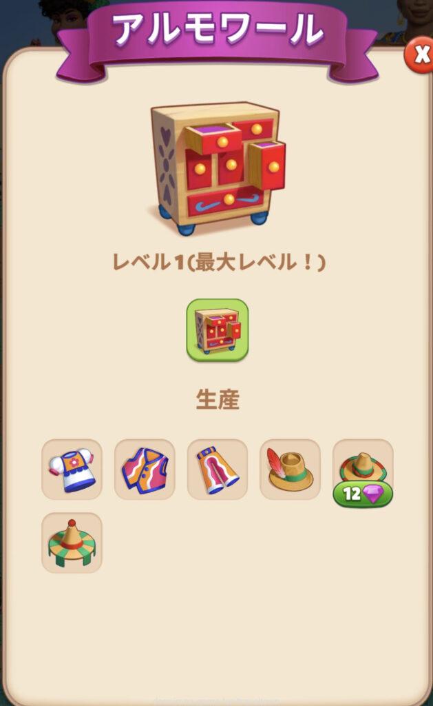 - レベルアップ時にもらう宝箱に入っている月、太陽でそれぞれレベルアップさせるとアルモワールからはシャツ(服のライン)、エレガントなベランダからはアボカドの種(⇒アボカドのライン)が出るようになる