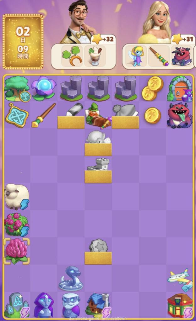 - レベルが上がるごとにもらえる飛行機のチケットが盤面にある状態でTravel Townの飛行機をタップする⇒メダル、ダイヤが出る