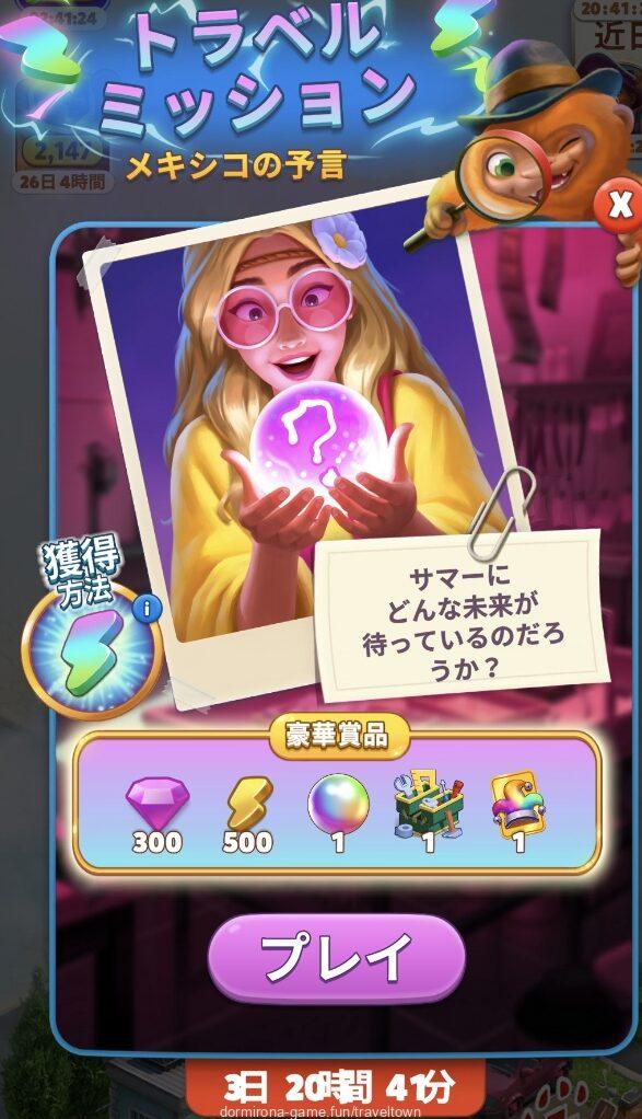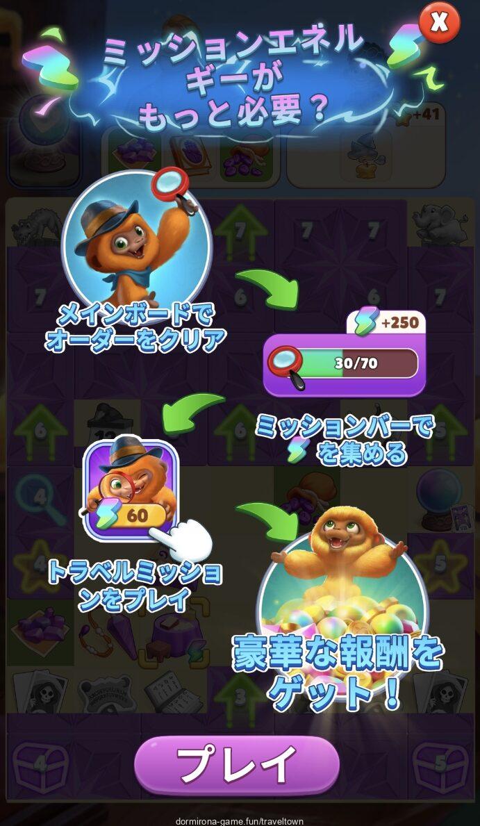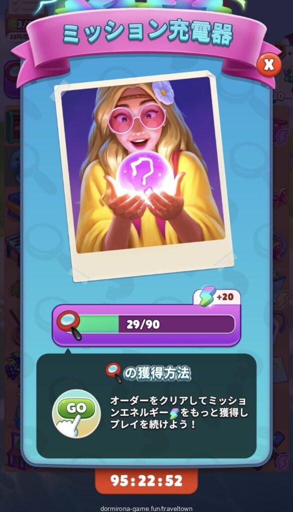 - 自然回復はなく、メイン盤のオーダーをこなすことにより虫眼鏡を集め、所定の数を集めてミッションバーの最後まで行くと青エナジーがもらえる